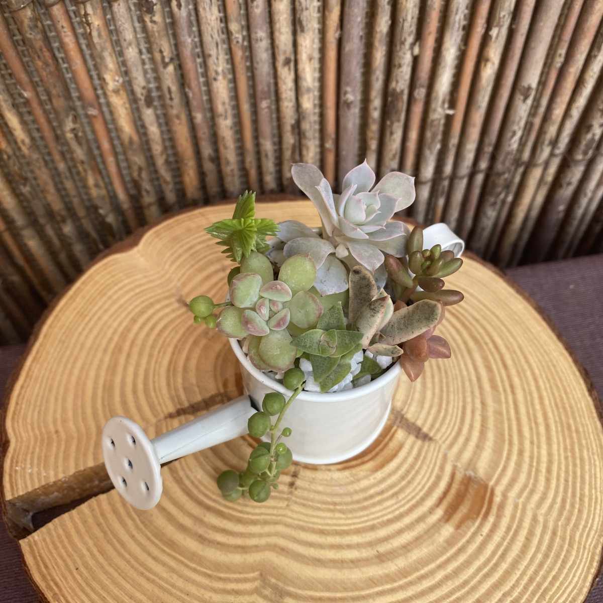 Está compuesta por 7 suculentas diferentes, una manera de tener varias suculentas en una regaderita super mona.