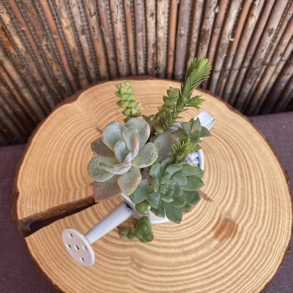 Está compuesta por 7 suculentas diferentes, una manera de tener varias suculentas en una regaderita super mona.
