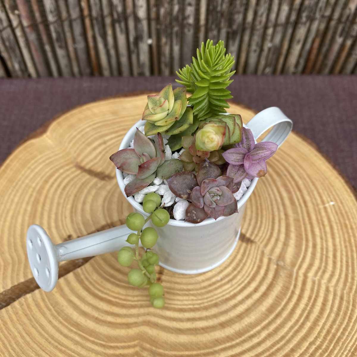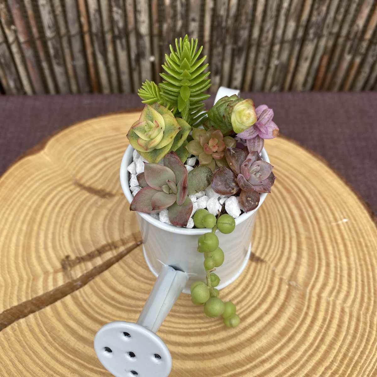 Está compuesta por 7 suculentas diferentes, una manera de tener varias suculentas en una regaderita super mona.