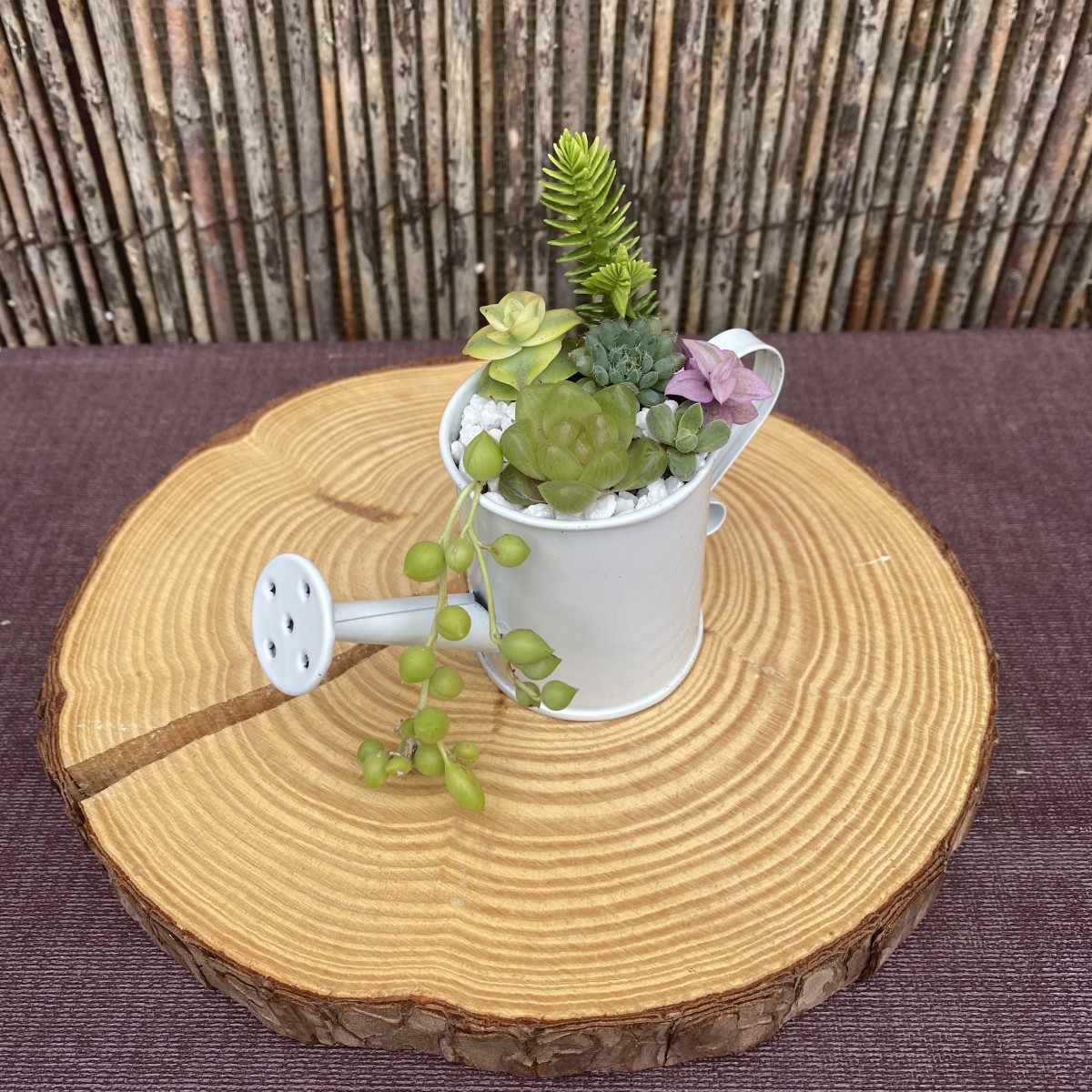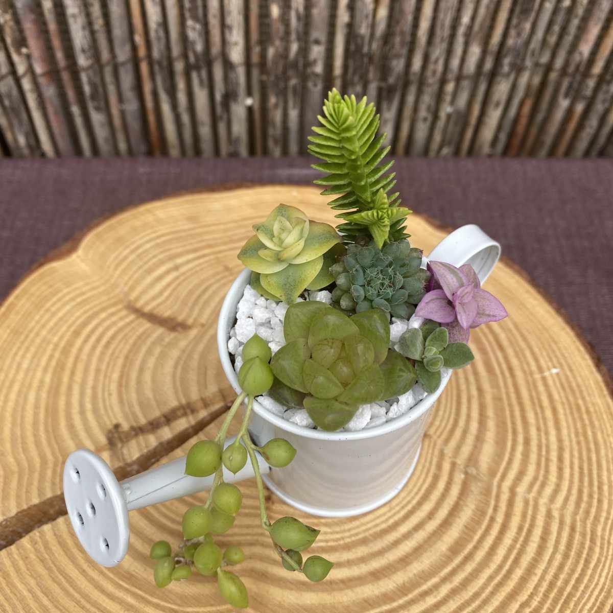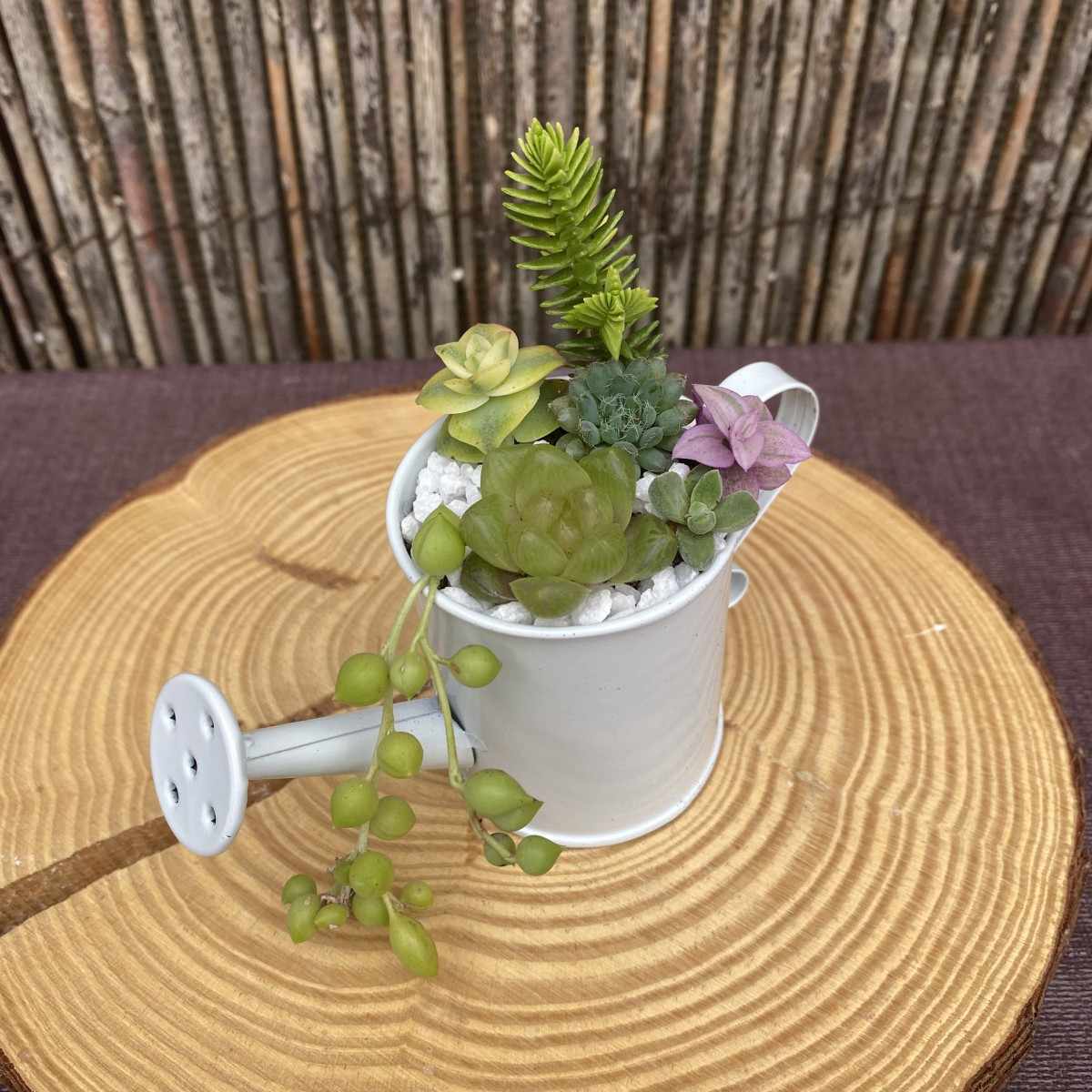 Está compuesta por 7 suculentas diferentes, una manera de tener varias suculentas en una regaderita super mona.