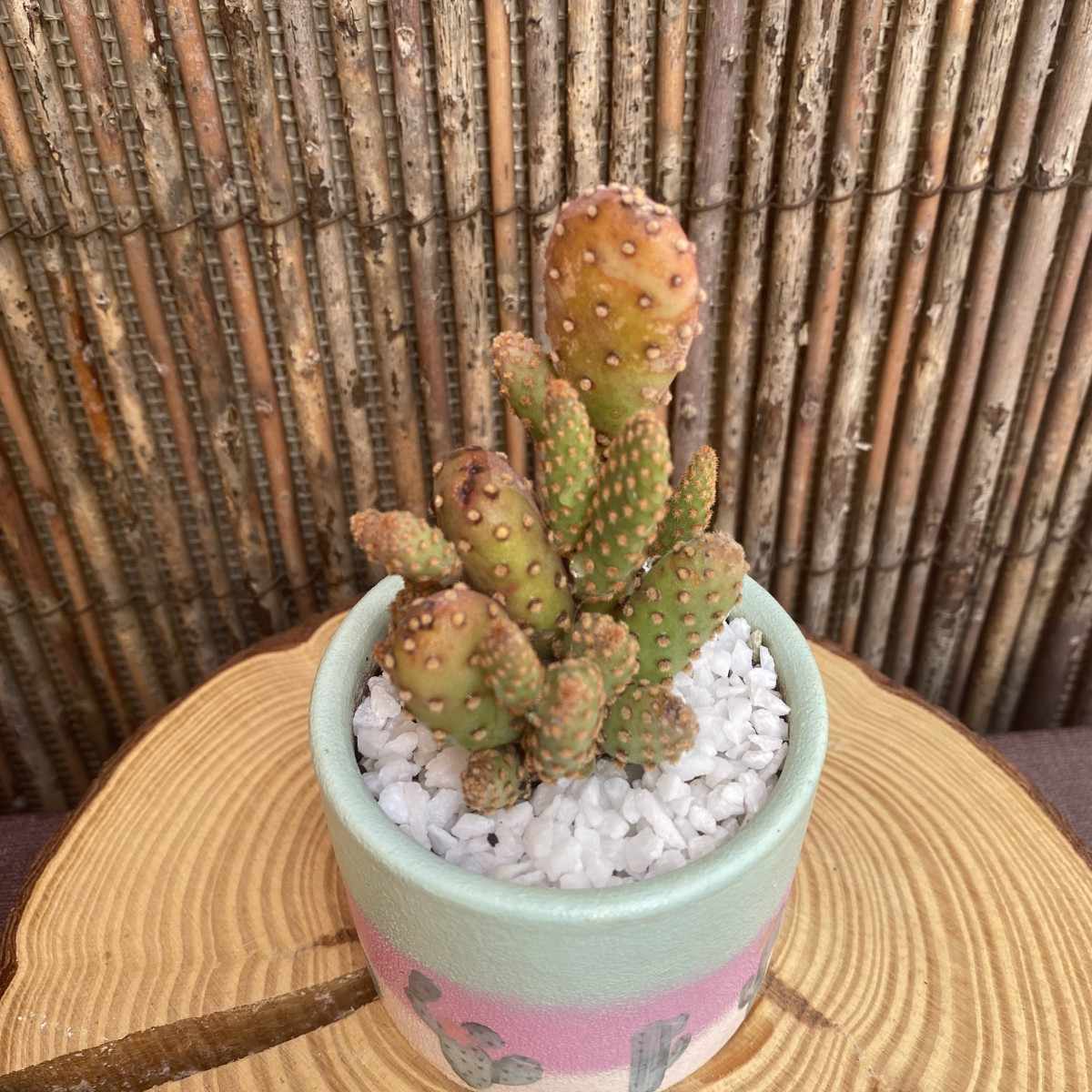 Cactus en maceta de terracota pintada a mano con diseños de cactus en decoupage.