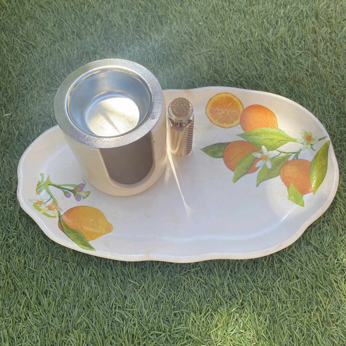 Bandeja de cemento hecha a mano con un diseño muy fino, lleva un tono clarito beis con un toque citrico, las naranjas con azahar que le dan un toque ideal, es perfecto para decorar con estilo.