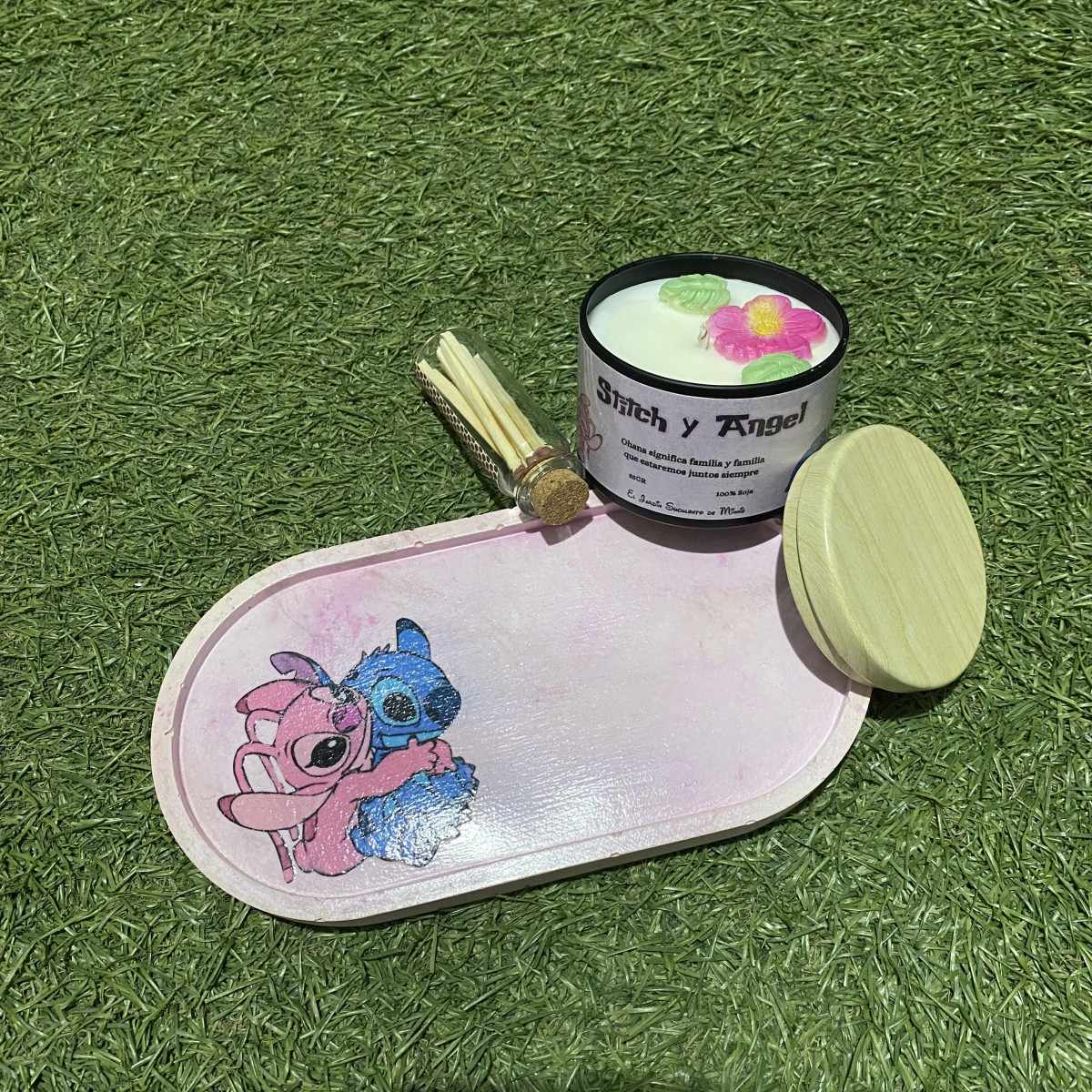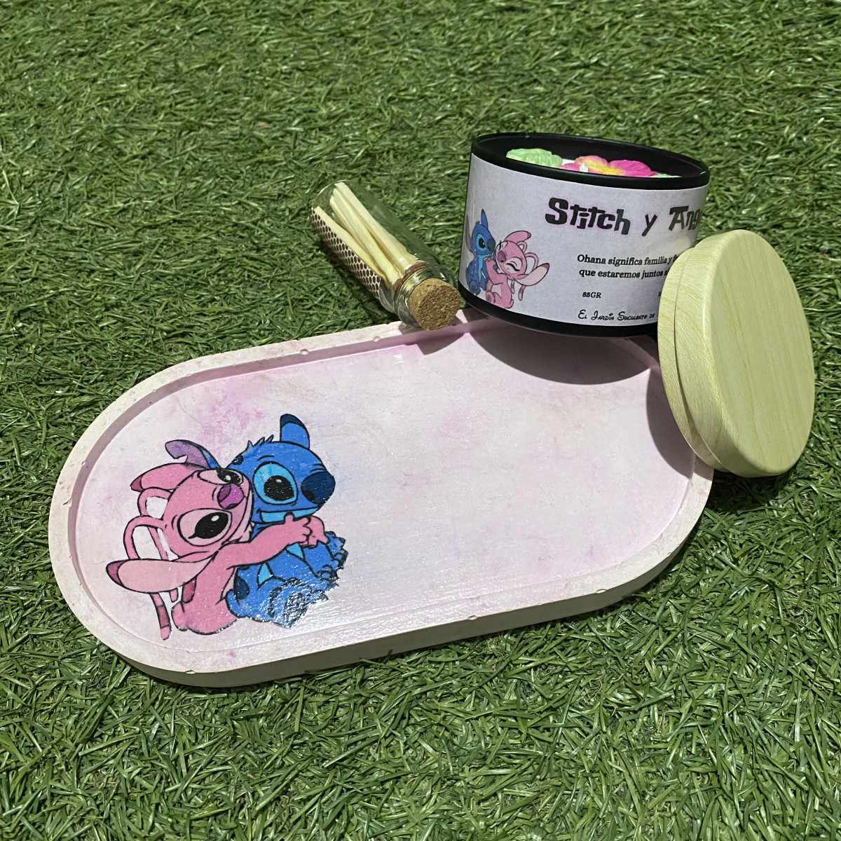 Incluye una bandeja pequeña de cemento en tono rosita, decorada con un precioso diseño de Stitch y Angela, perfecta para dar un toque especial a cualquier rincón de tu hogar.