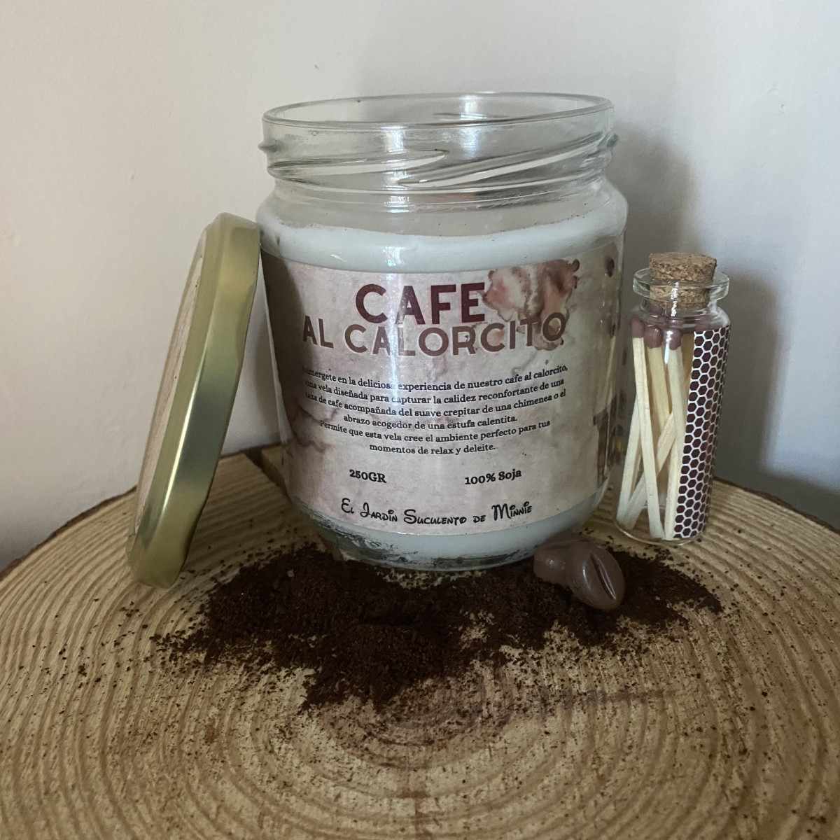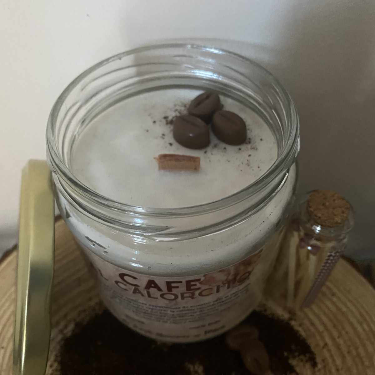 - Contiene decoración (granos de cafe de cera de soja y cafe molido)
