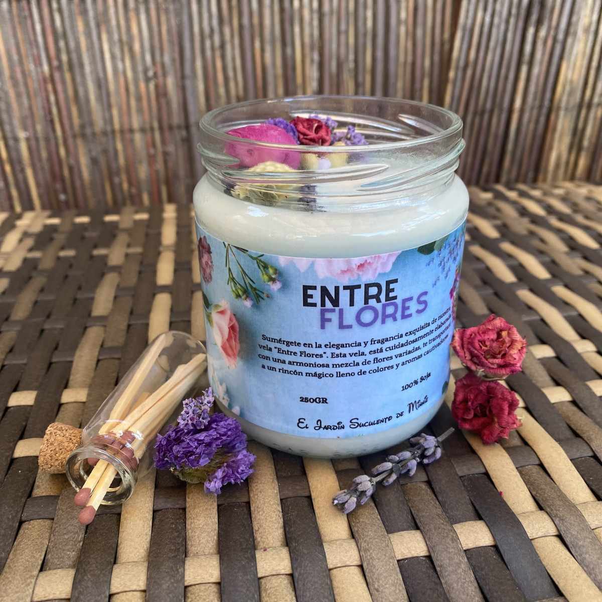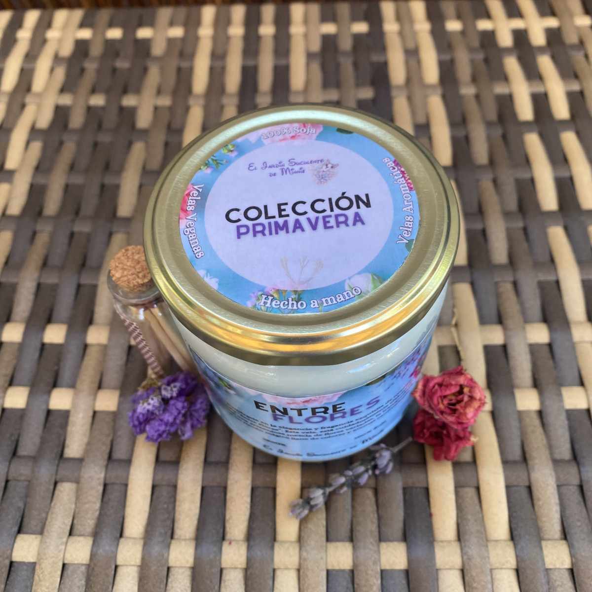 ¡Embárcate en un viaje aromático lleno de colores y aromas con nuestra vela "Entre Flores"!