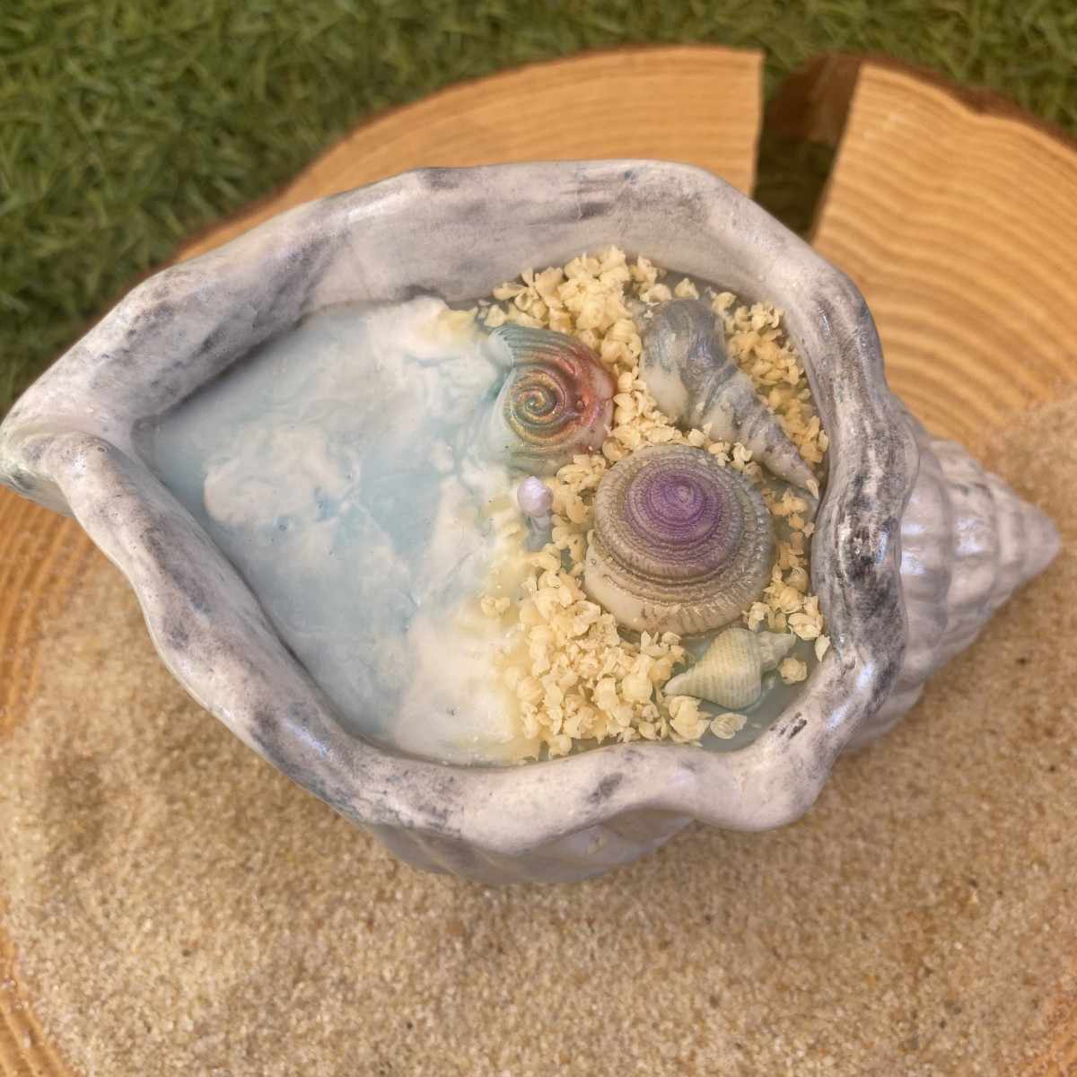 Está delicadamente decorada con arena de cera de soja, pequeñas conchitas de cera de soja y las olas del mar también recreadas en cera, convirtiéndola en una pieza artesanal muy especial. 🐚✨