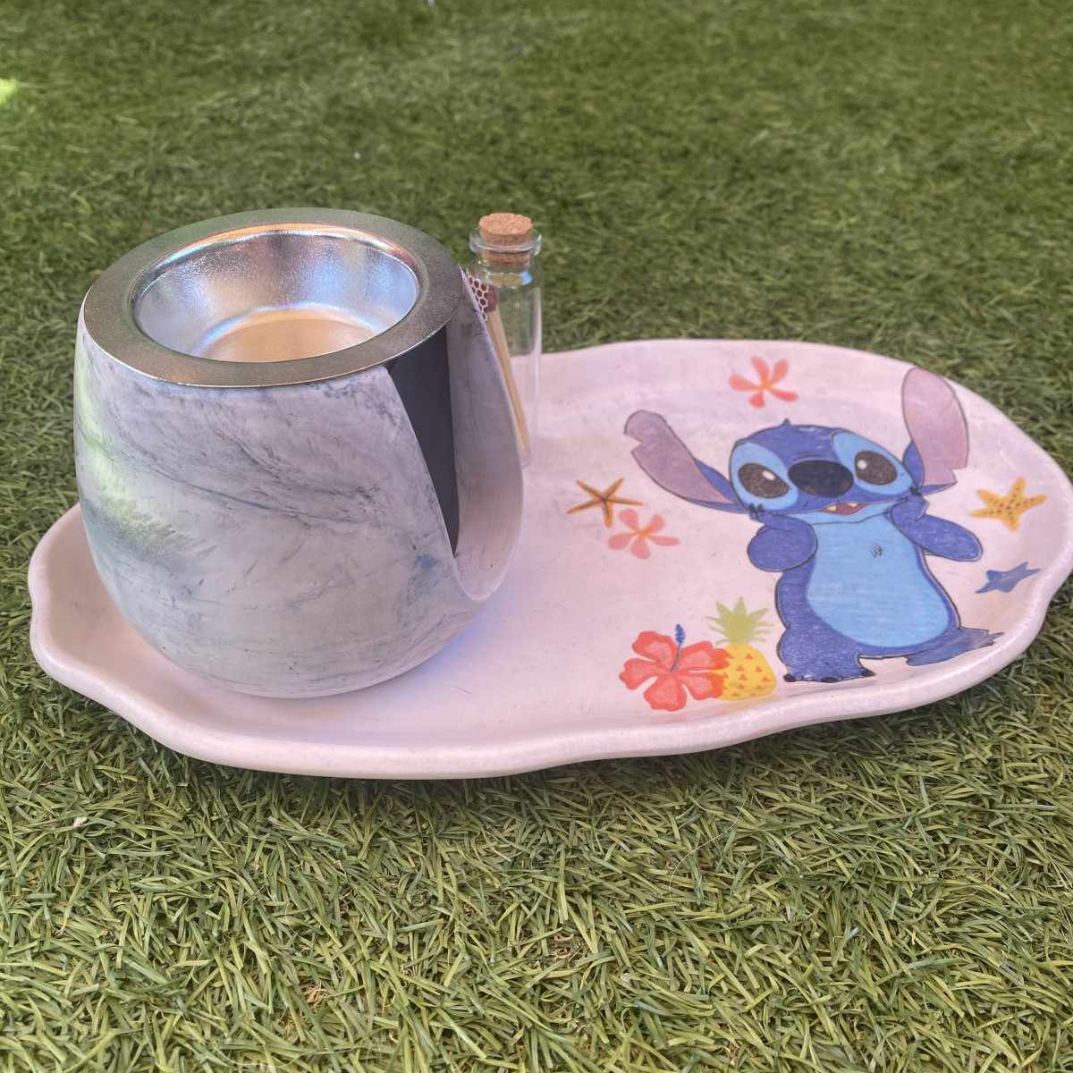 Este set único está formado por una bandeja grande en tono lila clarito, decorada con un diseño exclusivo de Stitch, y un quemador grande marmoleado en tonos azules, perfecto para dar un aire especial y acogedor a cualquier rincón. 💜🌊
