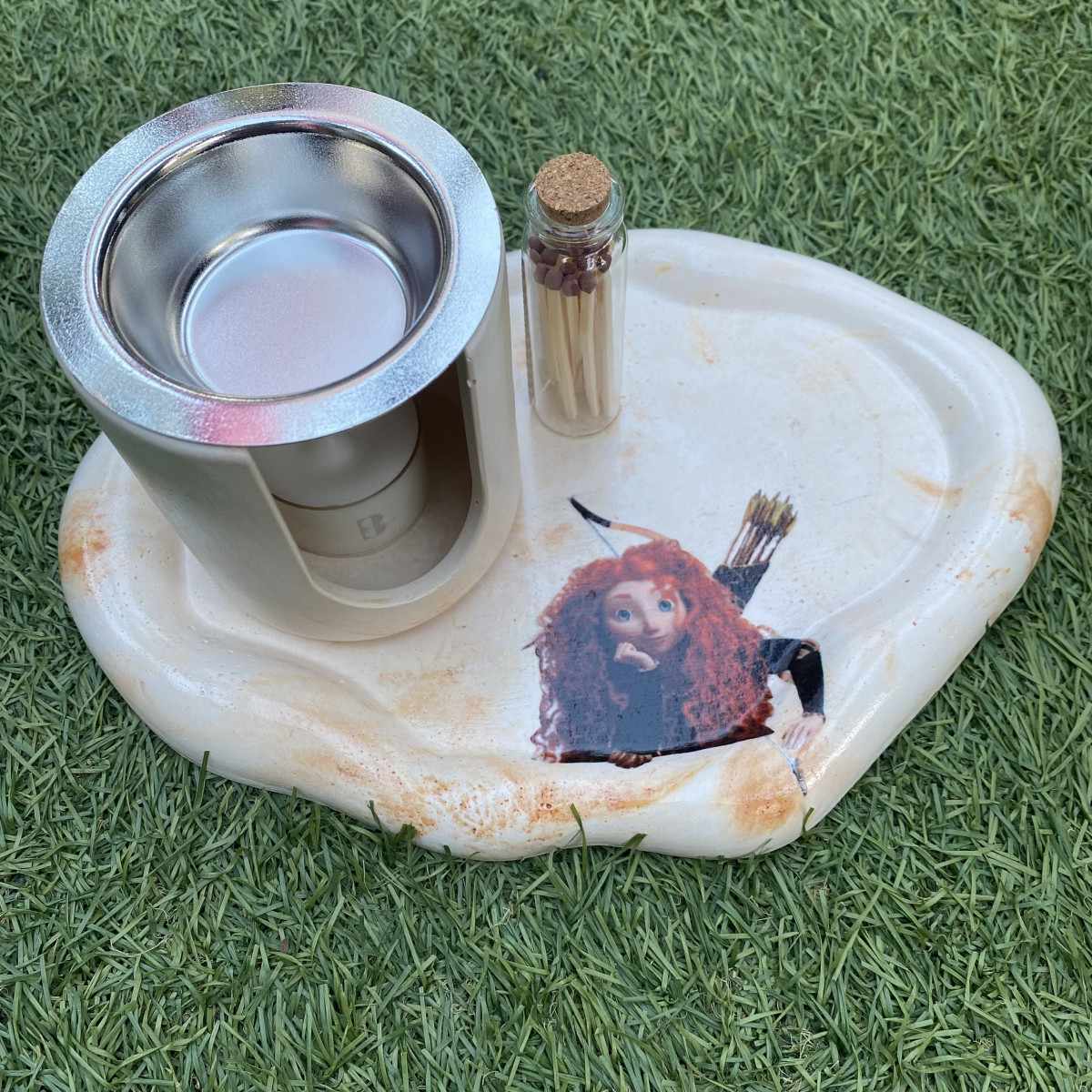 Déjate llevar por la magia de las Highlands con esta bandeja artesanal de cemento acompañada de quemador, inspirada en la valentía y el espíritu libre de Mérida.