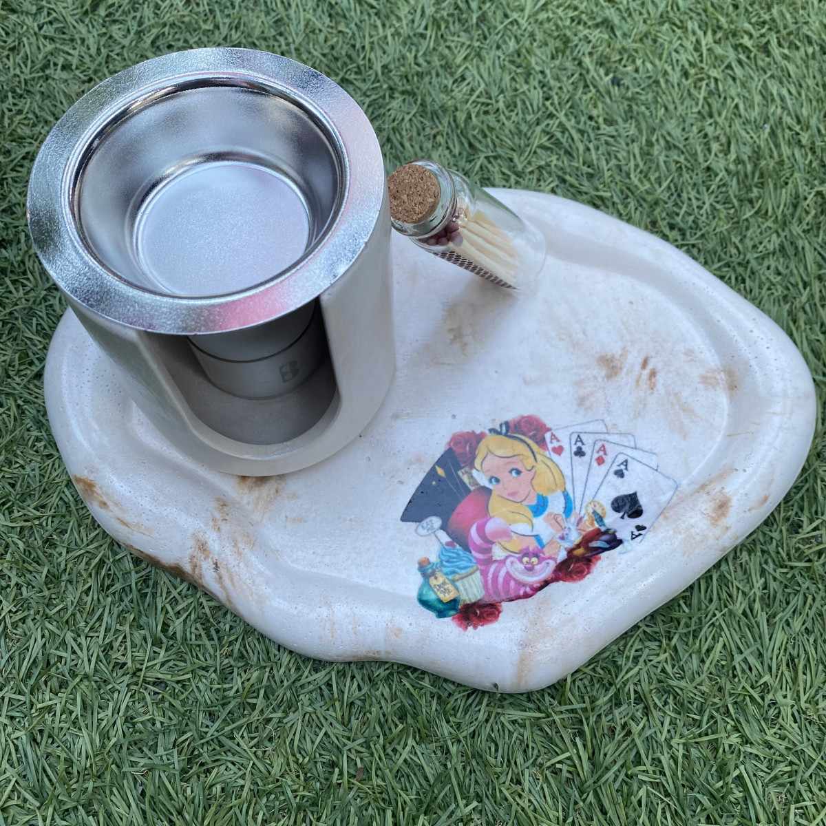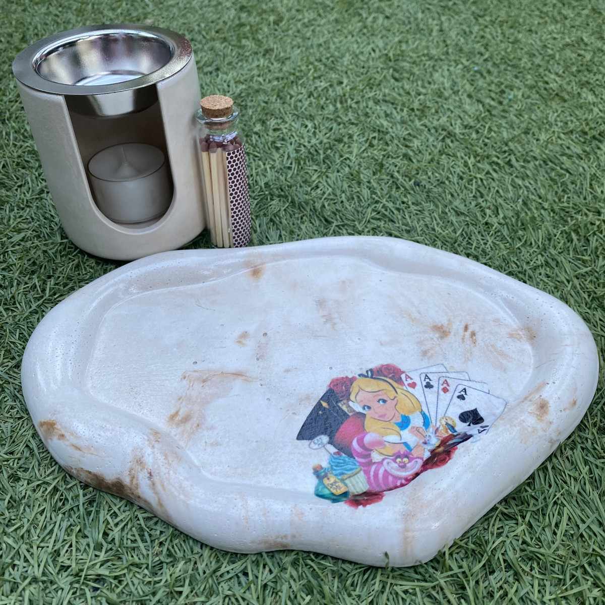 El marmolado marrón de la bandeja aportan profundidad y un aire vintage, recordando relojes antiguos, tazas de té y senderos misteriosos, mientras que el acabado artesanal convierte cada pieza en algo único.