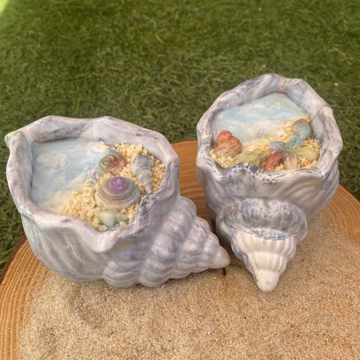 Cada vela está decorada con arena de cera de soja, pequeñas conchitas de cera de soja y las olas del mar recreadas en cera, haciendo de este conjunto una pieza artesanal única y muy especial. 🐚✨