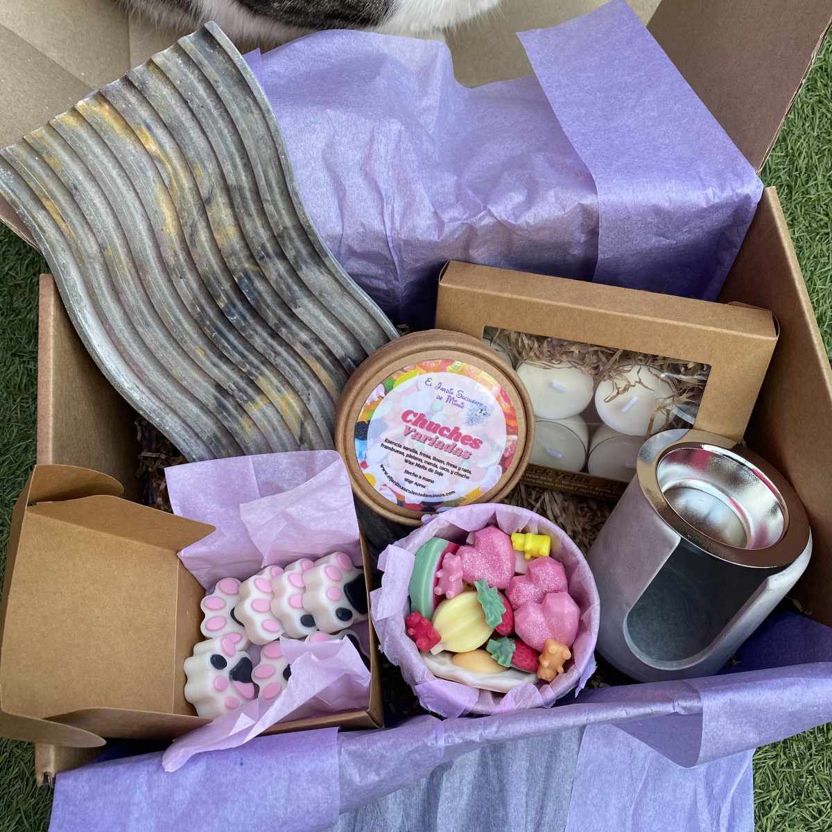 - Caja con 6 velitas de té de cera de soja: Hechas a mano, con una combustión limpia y prolongada.