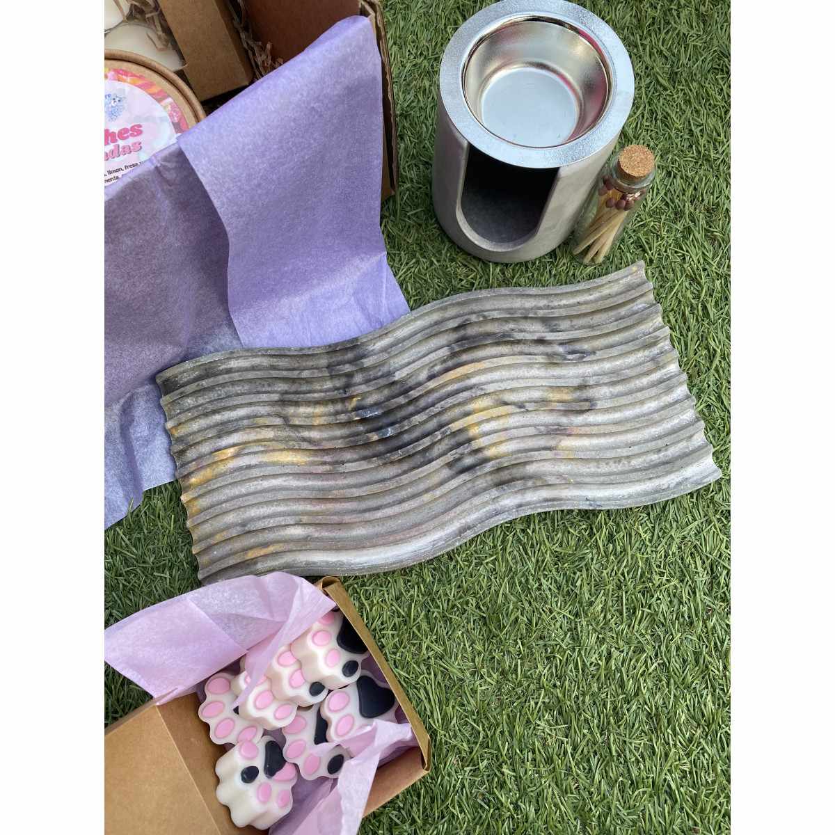 - Quemador artesanal de cemento: Perfecto para disfrutar de tus wax melts favoritos. Su diseño minimalista combina con cualquier ambiente.