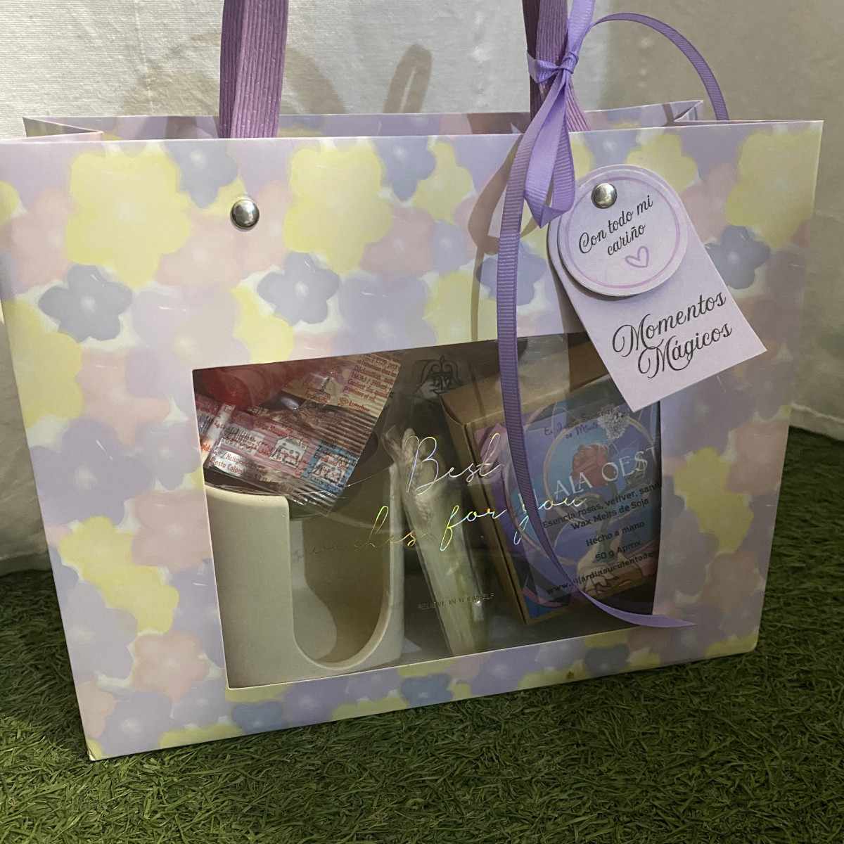 El conjunto se completa con un lazo lila, aportando ese toque final de regalo cuidado y lleno de mimo.
