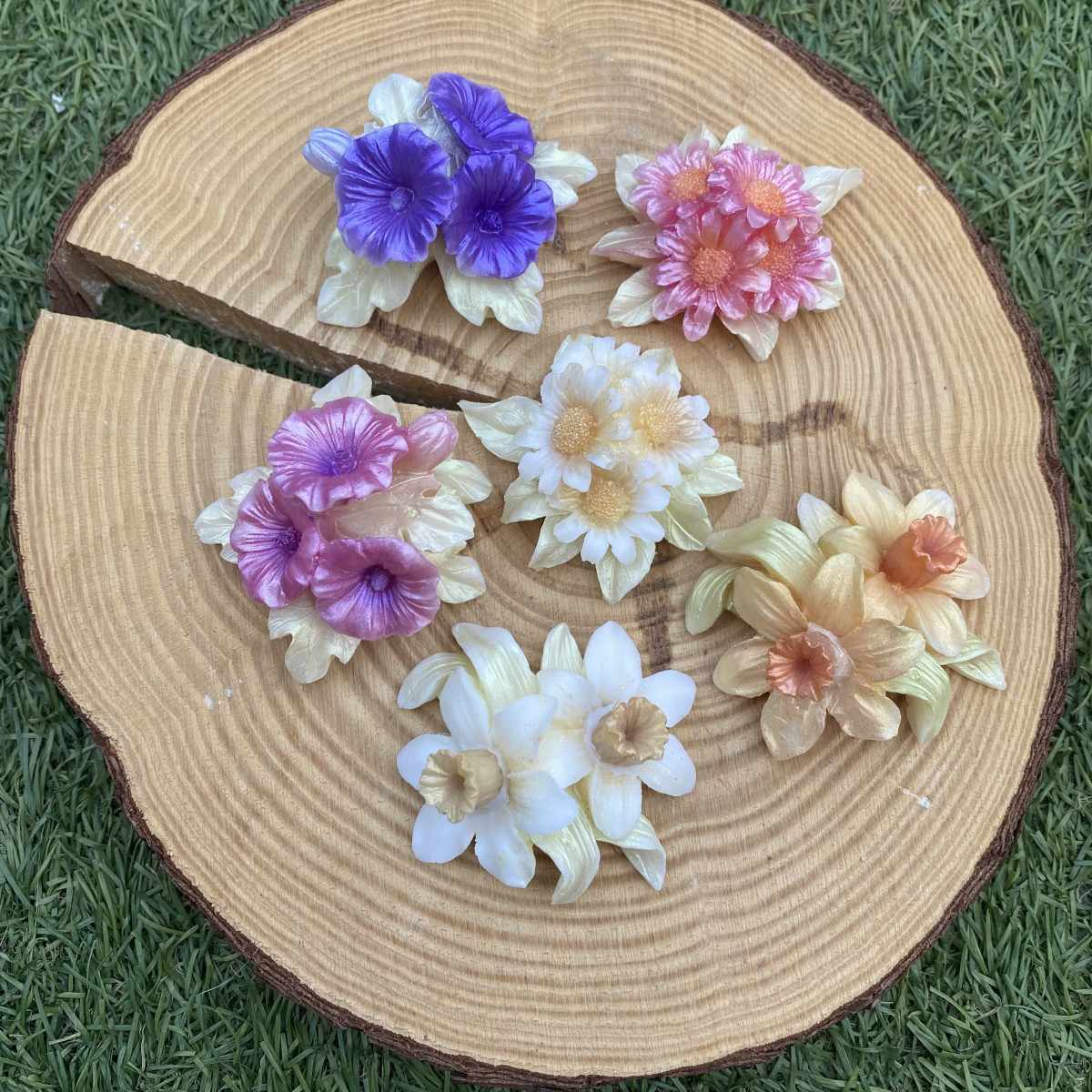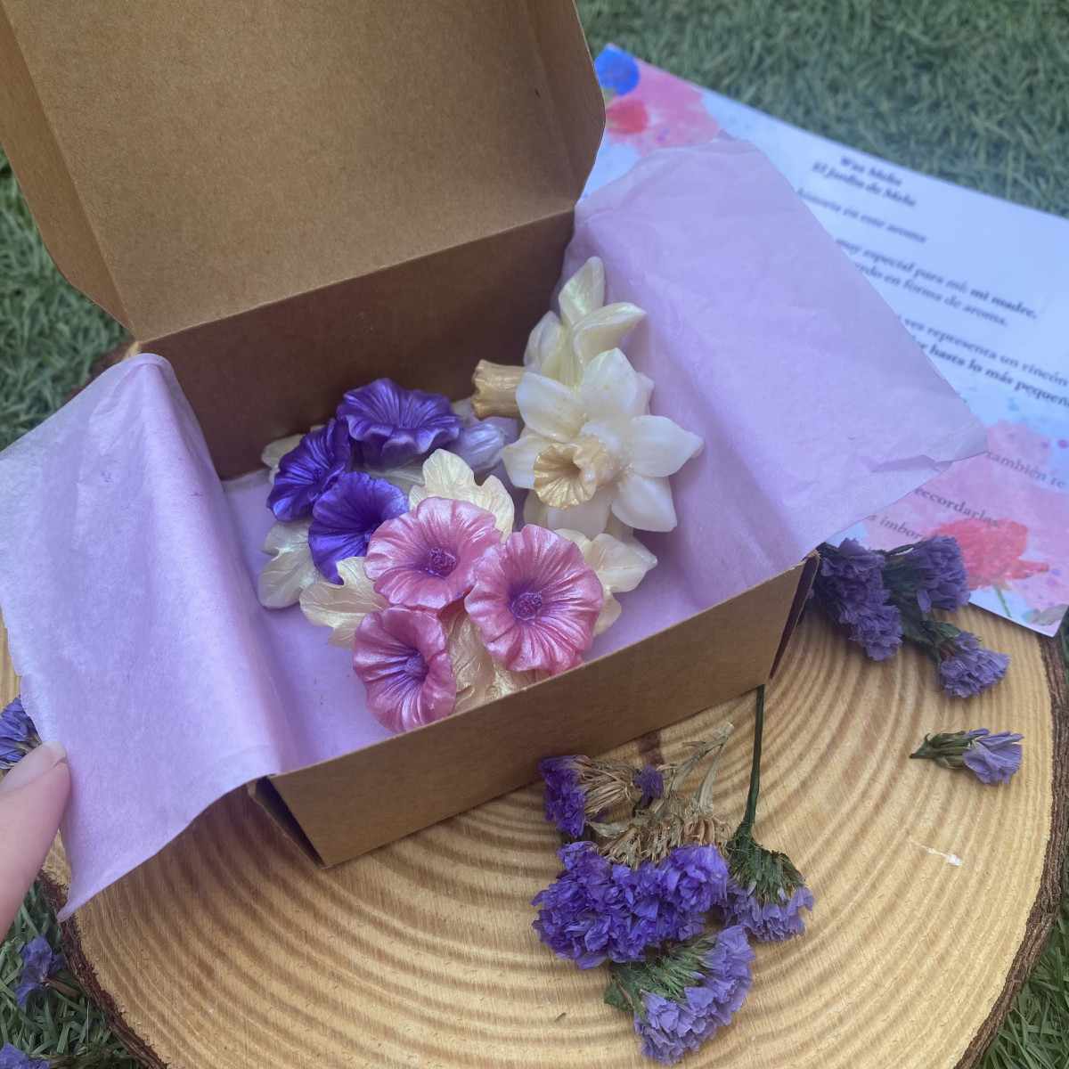 Cada figura hojitas, flores delicadas, pétalos en calma— representa ese pedacito de naturaleza que Melu cultiva en casa, ahora transformado en un homenaje aromático.
