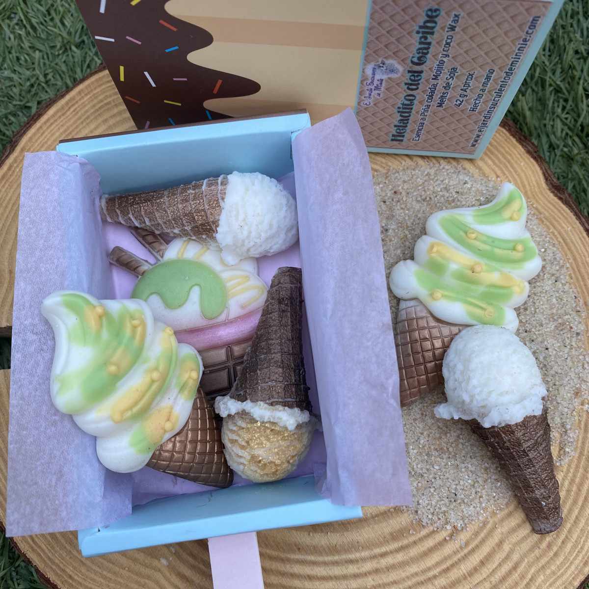 Heladito del Caribe está lleno de figuritas grandes de helados de cucurucho, con detalles irresistibles que evocan sabores y paisajes tropicales.