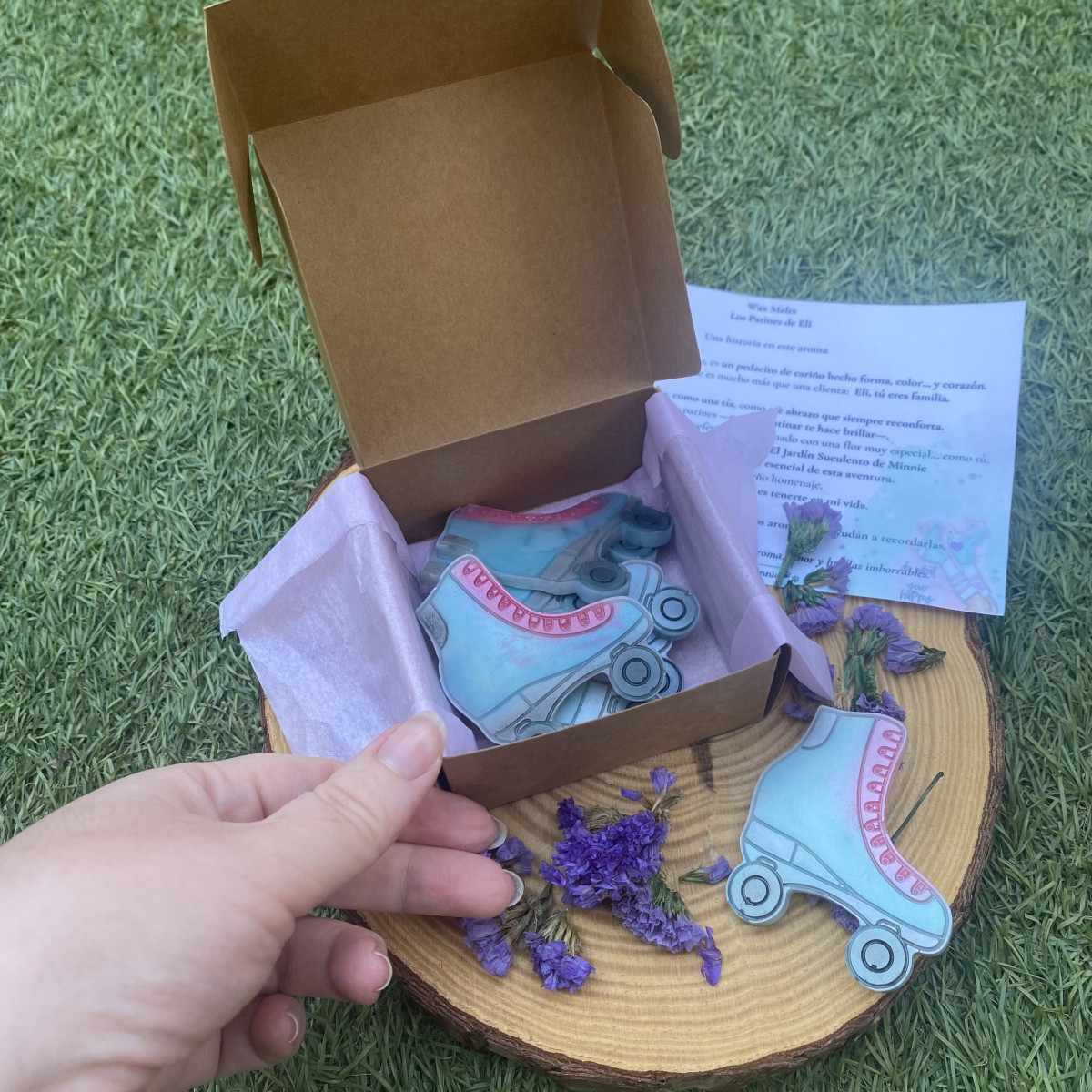 Este wax nace de su amor por patinar en tranquilidad, por esos momentos de aire puro, de calma, de conexión con una misma. Y, por supuesto, de su color favorito: el agua marina, presente en cada figura de patín que compone esta pieza tan especial.