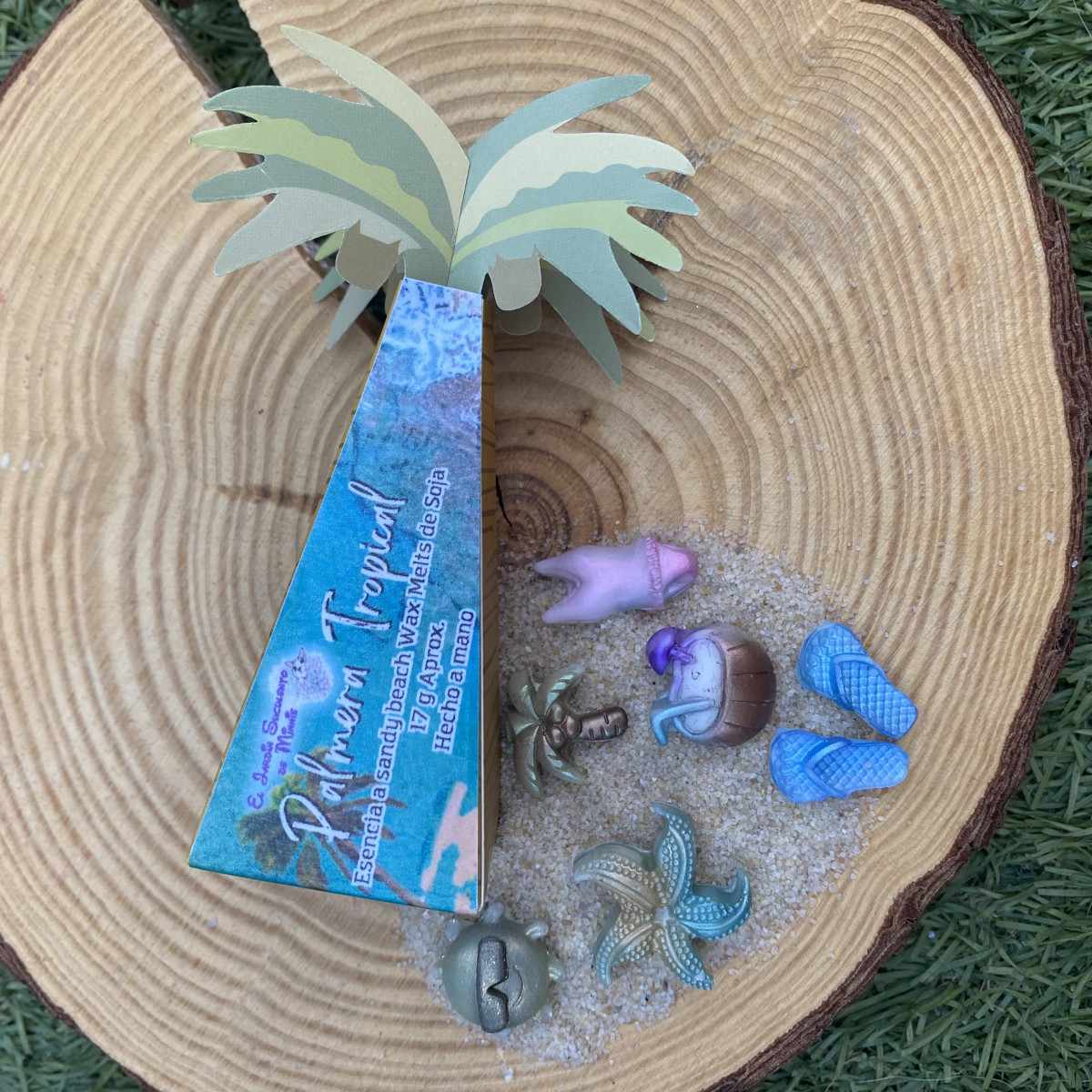 Dentro de una preciosa cajita con forma de palmera, encontrarás pequeños soles con gafas, aletas y gafas de buceo, chanclas, cocos, bañadores, conchas y hasta una palmerita con cocos.